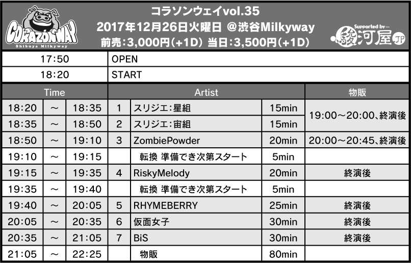 12月26日(火)『コラソンウェイ vol.35 Supported by 駿河屋』タイムテーブル発表
