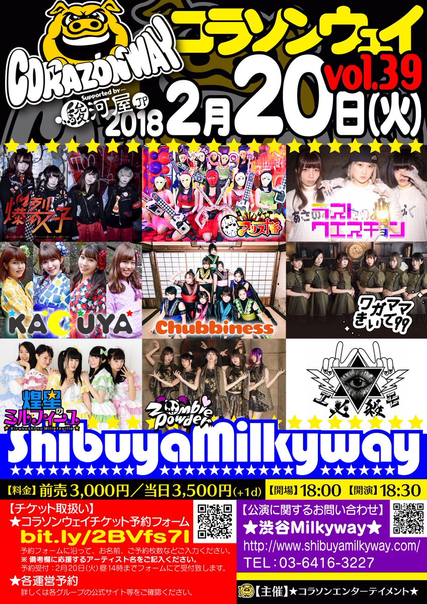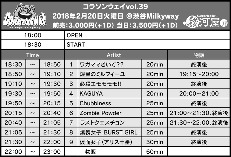 2月20日(火)『コラソンウェイvol.39 Supported by 駿河屋』渋谷Milkywayにて開催。