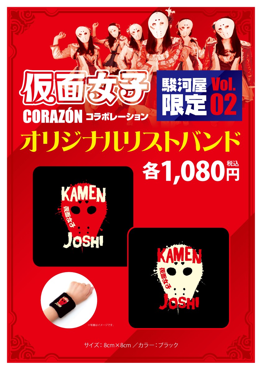第2弾『KAMEN JOSHI リストバンド』は2月21日(水)販売開始予定。そして駿河屋秋葉原駅前店、駿河屋静岡本店、エーツー日本橋店では店舗限定の『仮面女子 缶バッチ ガチャ』も同日販売開始予定となっています。